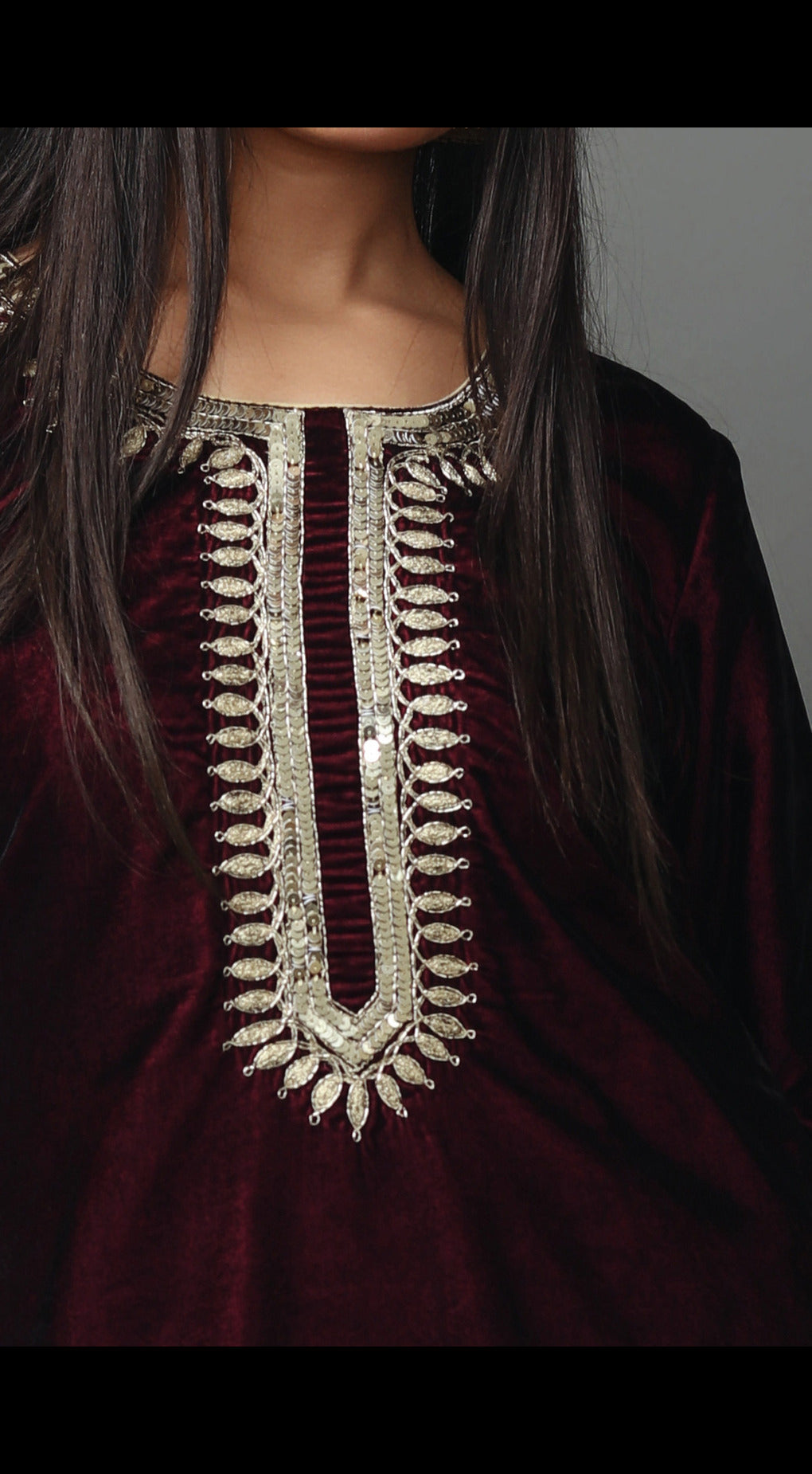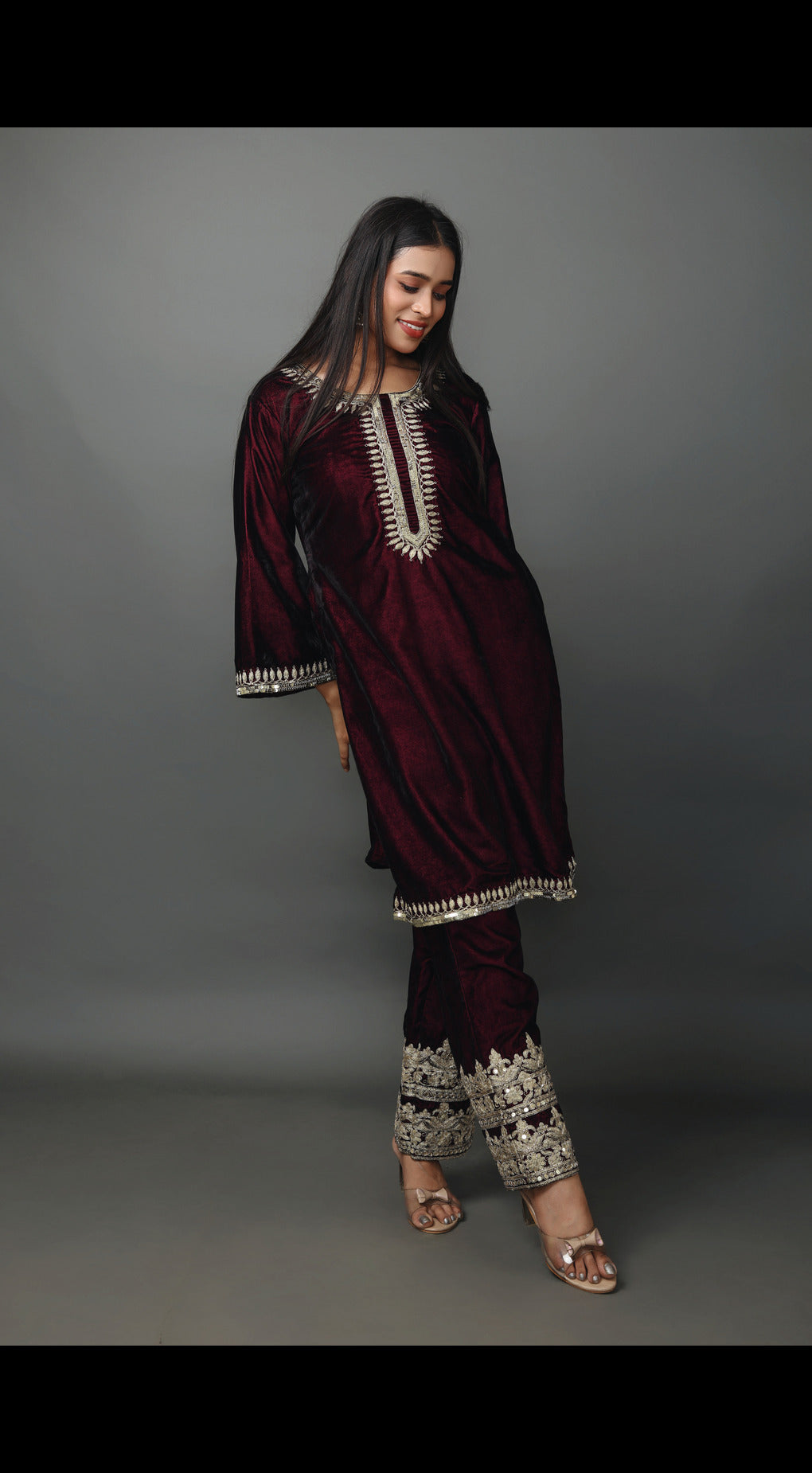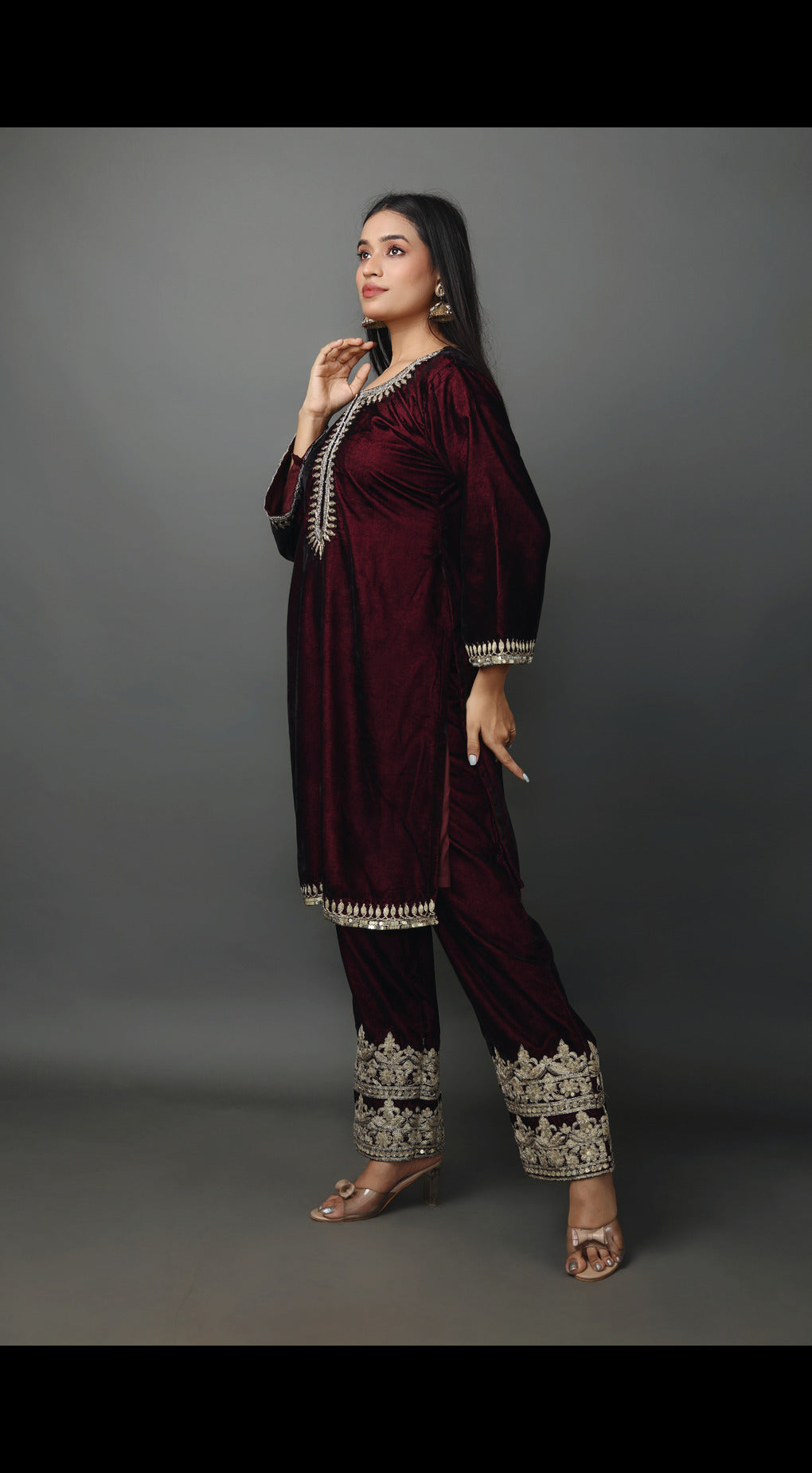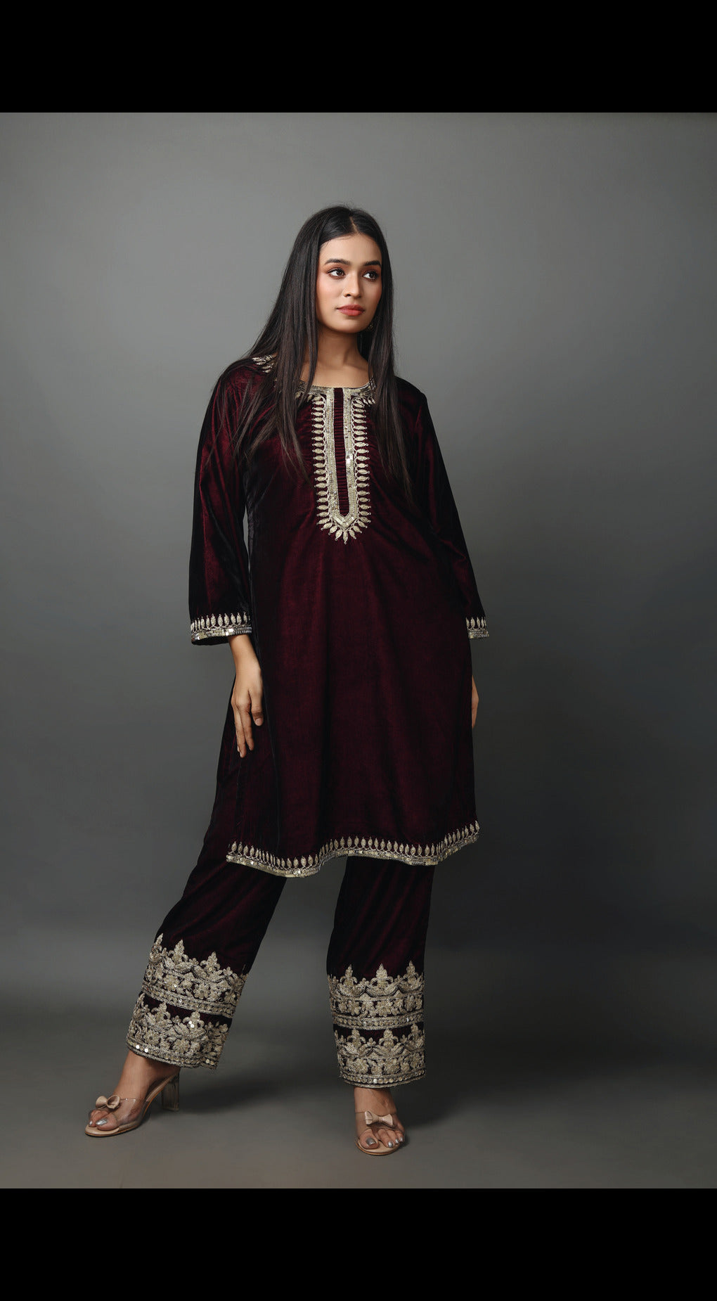 This rich velvet kurta set is designed with exquisite Dori work and intricate hand-embroidered detailing along the neckline, sleeves, and pants. The luxurious velvet fabric provides a soft drape, while the detailed embroidery adds a touch of sophistication. Perfect for festive events or formal gatherings, this outfit is a beautiful blend of tradition and modernity.