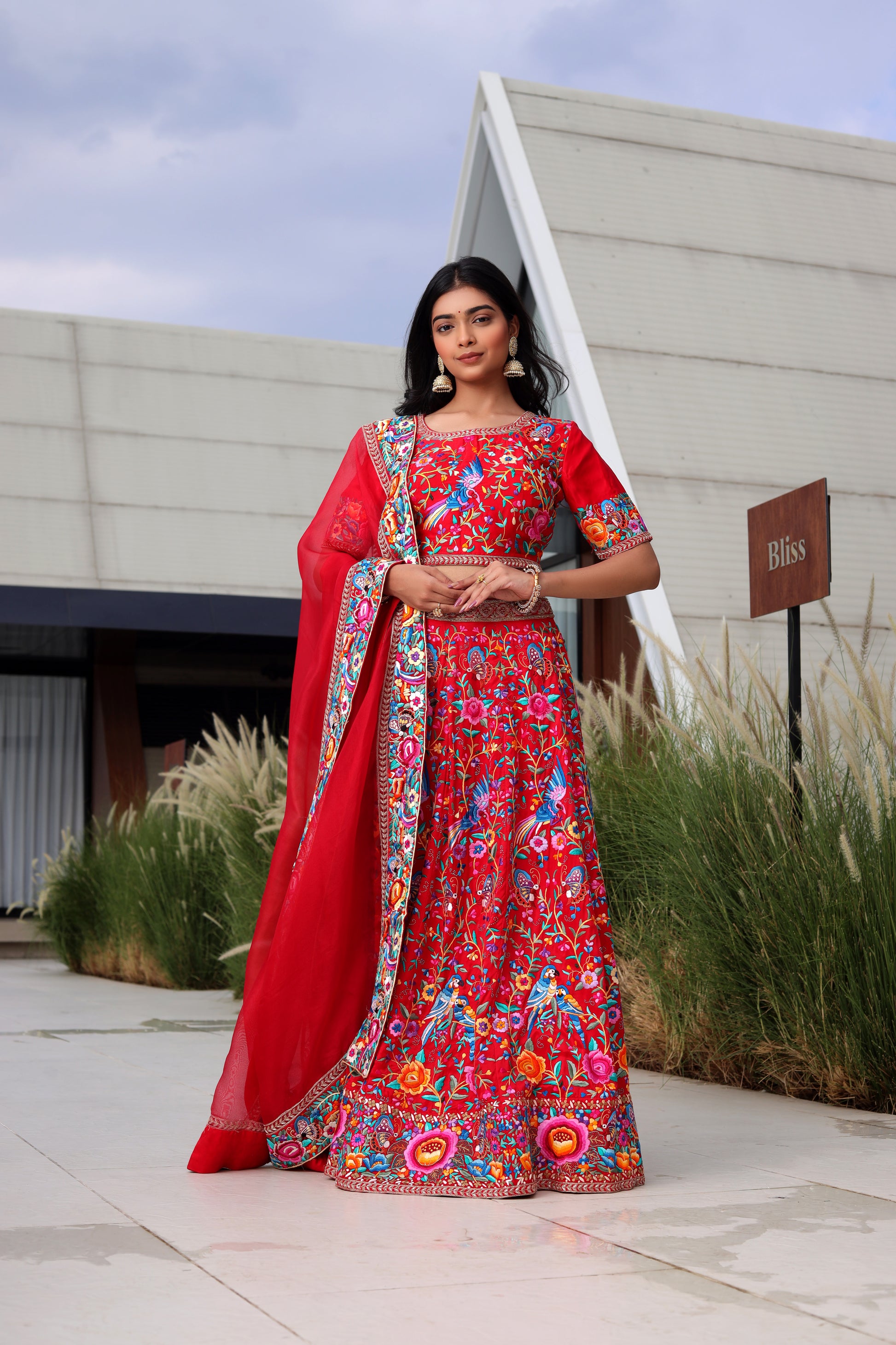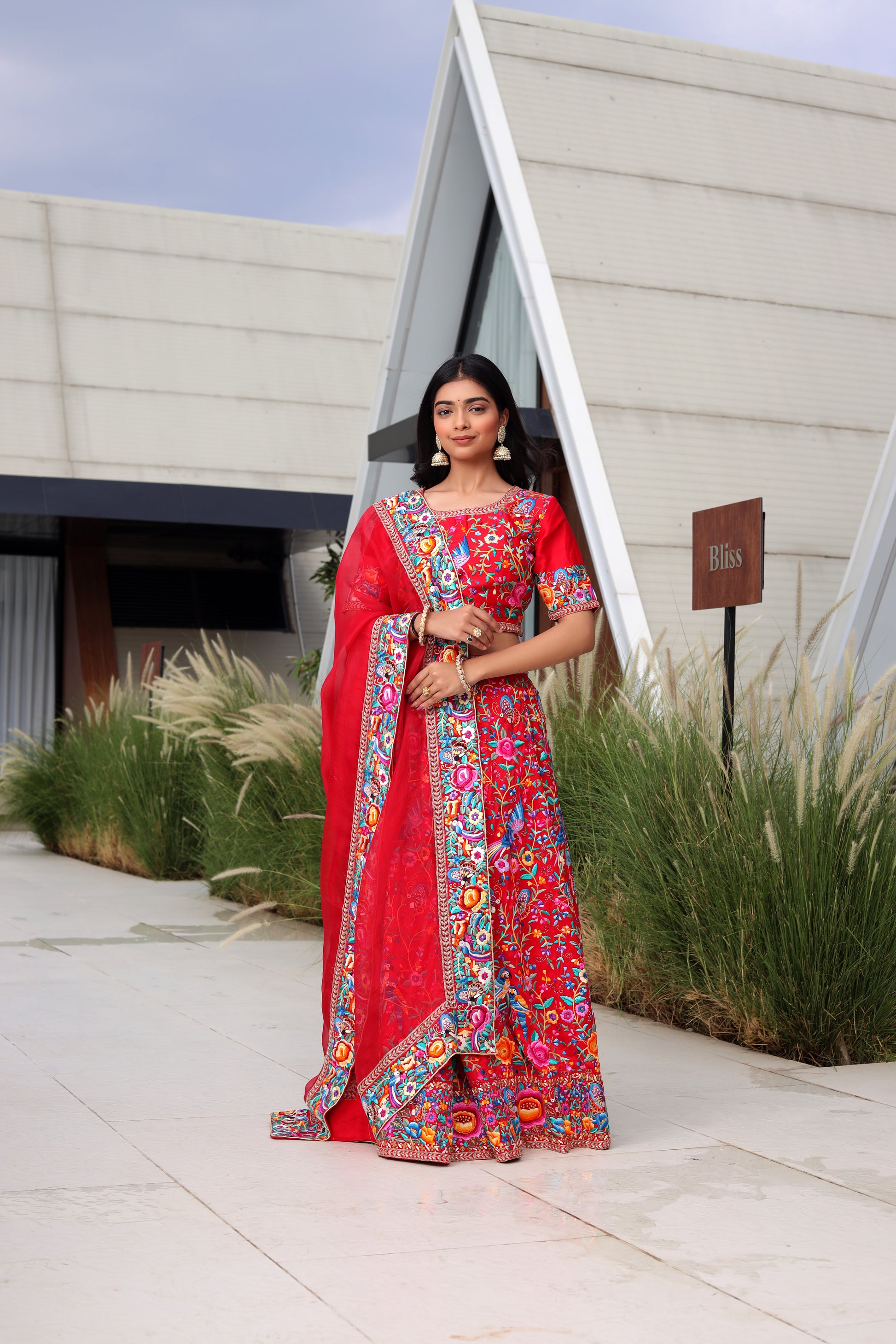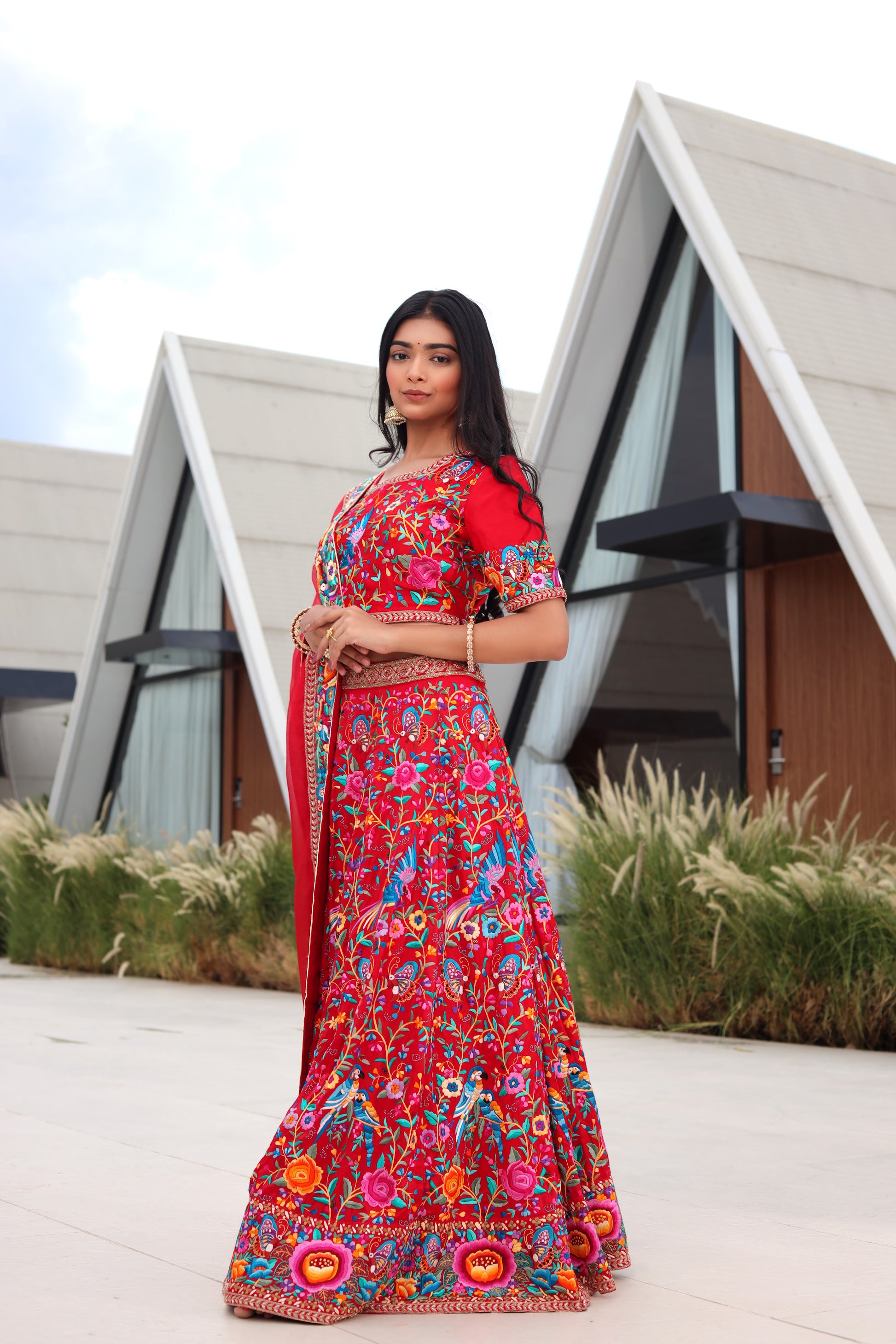 Crafted from pure crepe organza, this vibrant red lehenga is adorned with intricate hand-embroidered short needle Parsi Gara work, accented by zardosi highlights. The set includes a santoon and cancan lining for added volume and structure. Available in red with multi-colored embroidery, this piece can be customized in other colors upon request.